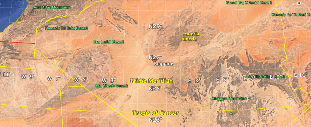 This led me to draw a perpendicular line to the MON/666. I had already looked for significant points within the context of the show: too high for Hong Kong, too low for Tibet or the USA… The only thing I could think of was the Sahara desert, mentioned in part 3 of the return (Jade’s car), but the line was too low for most places of interest in Egypt, for instance. Then, being French, I suddenly remembered that France has conducted various civilian and military ballistic rockets launches from the vicinity of the town of Reggane until 1965, and had also conducted four nuclear tests there during the Algerian War in 1960 and 1961, before the country’s independence. Given the importance of nuclear bombs in Twin Peaks (see part 8), it was worth looking at the town’s latitude. As evident on the image below, Reggane is located at 27°N, the one bisecting the North / South axis of the Americas at 66.6°W.